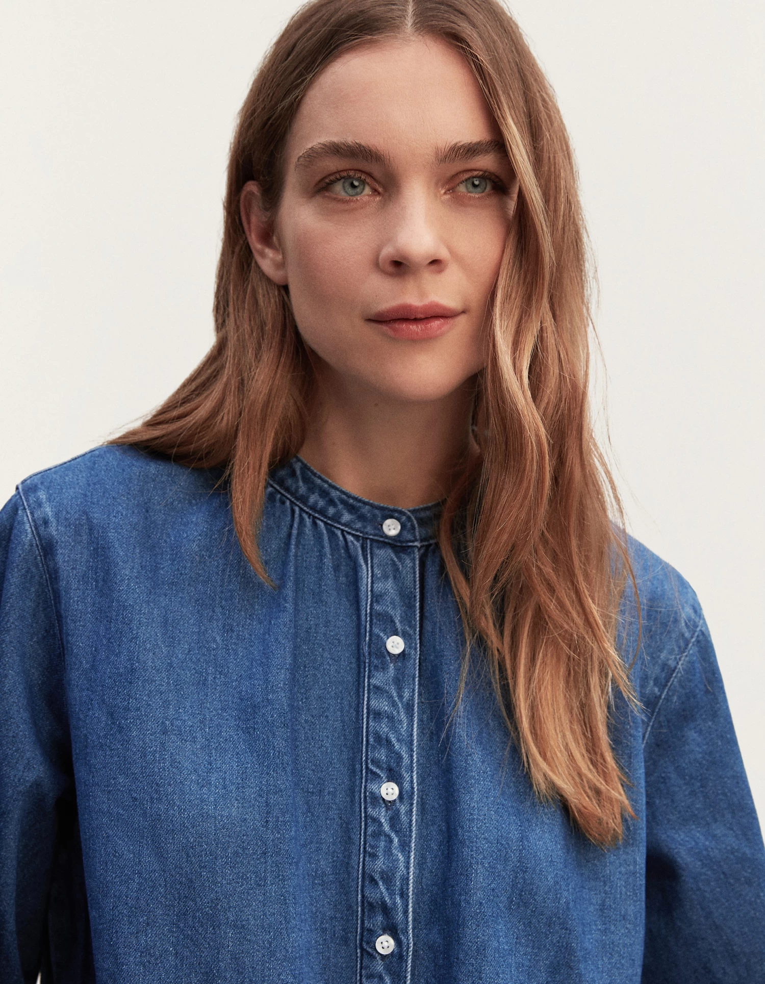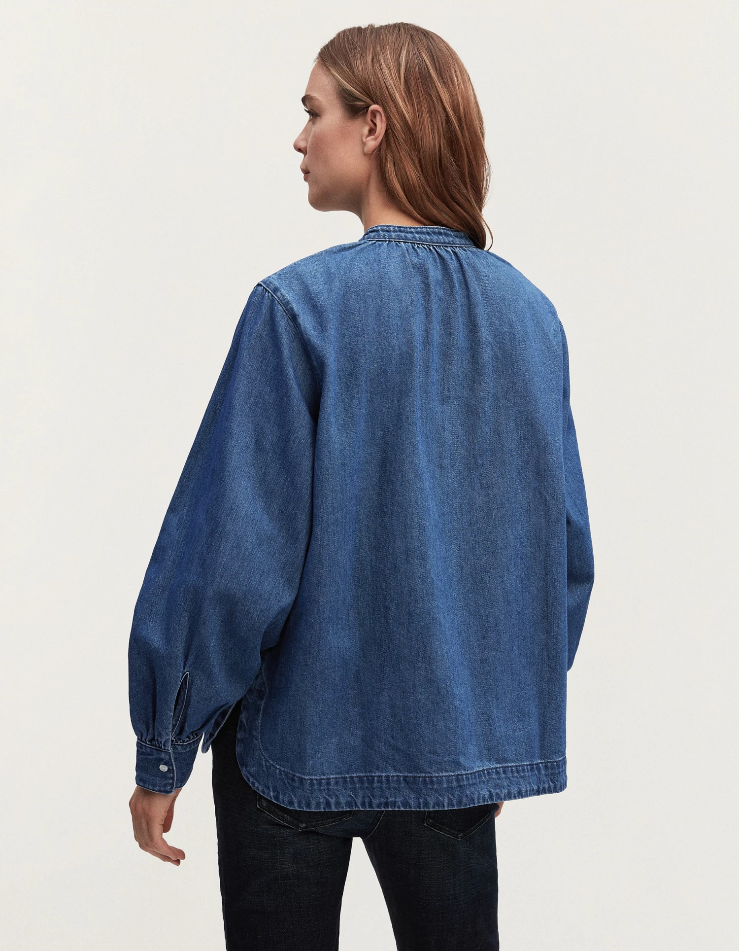 The BRITT SHIRT is our contemporary denim shirt for women. This shirt is made from classic indigo denim and features a medium-aged stonewashed finish and a mandarin-style collar. Complete with a contrasting button-up closure and balloon sleeves for a feminine touch.