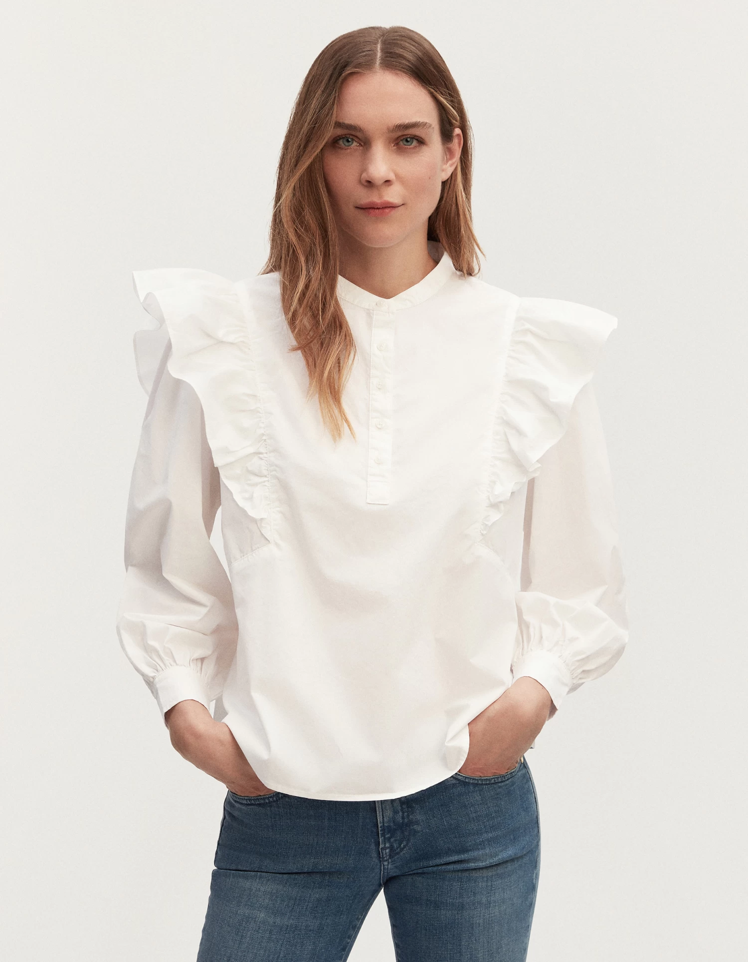 The DELILAH SHIRT is our seasonal ruffle shirt for women. This regular-fit shirt is made from classic cotton poplin fabric and features a half-placket on the front with ruffle shoulder detailing—the ideal piece to dress up a pair of classic blue jeans.