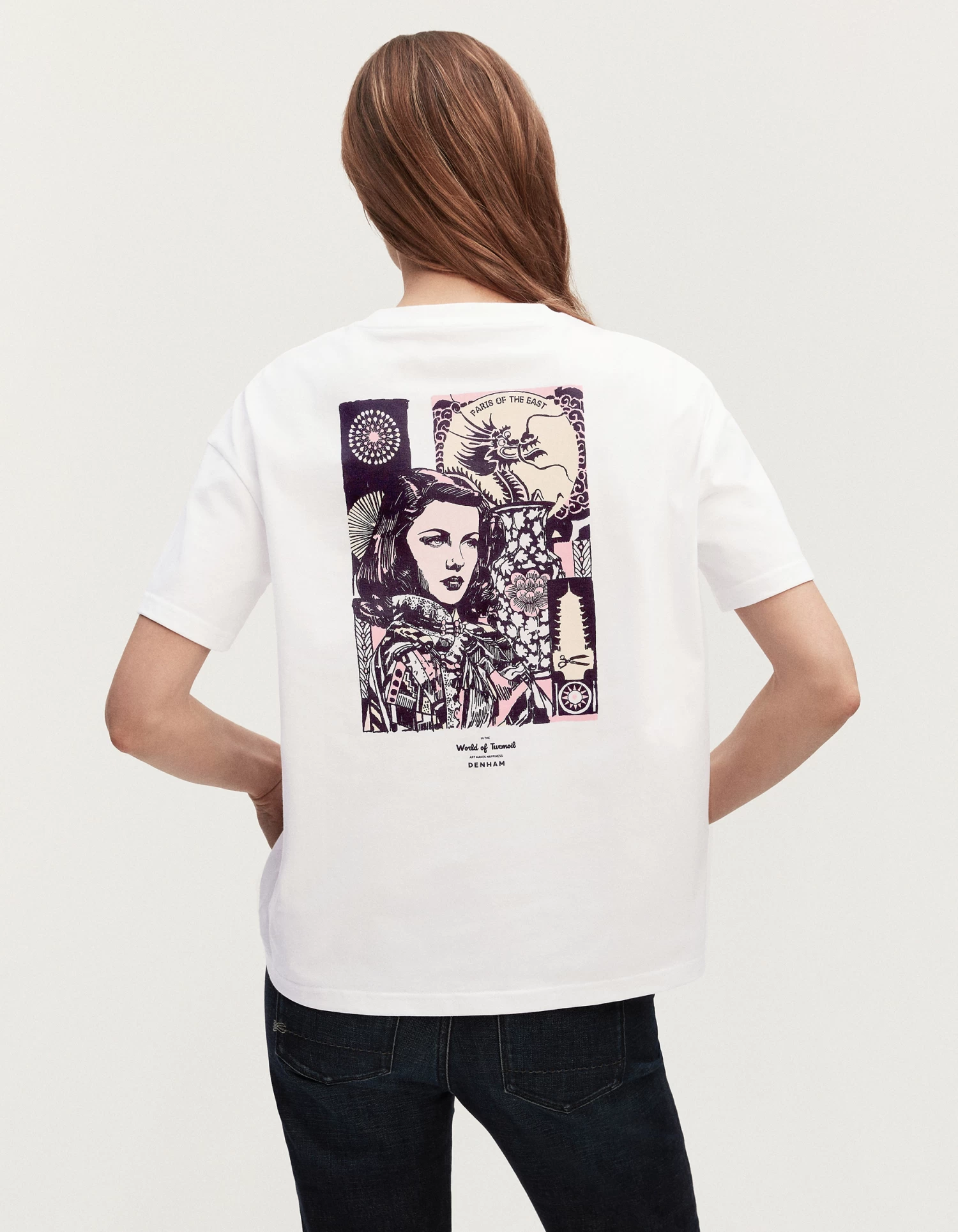 The DXT JANE FATALE Tee is part of our latest House Guest Artist series with artist and tattooist Rutger Termohlen from World of Turmoil. This limited-edition t-shirt is made from core cotton jersey, which gives it a heavier drape. The back of this boxy-fit tee features a large print inspired by traditional tattoo icons and our DENHAM world. The front bears a small print of the DENHAM x Turmoil world, our iconic scissor logo intertwined with a classic flash tattoo icon, the swallow.