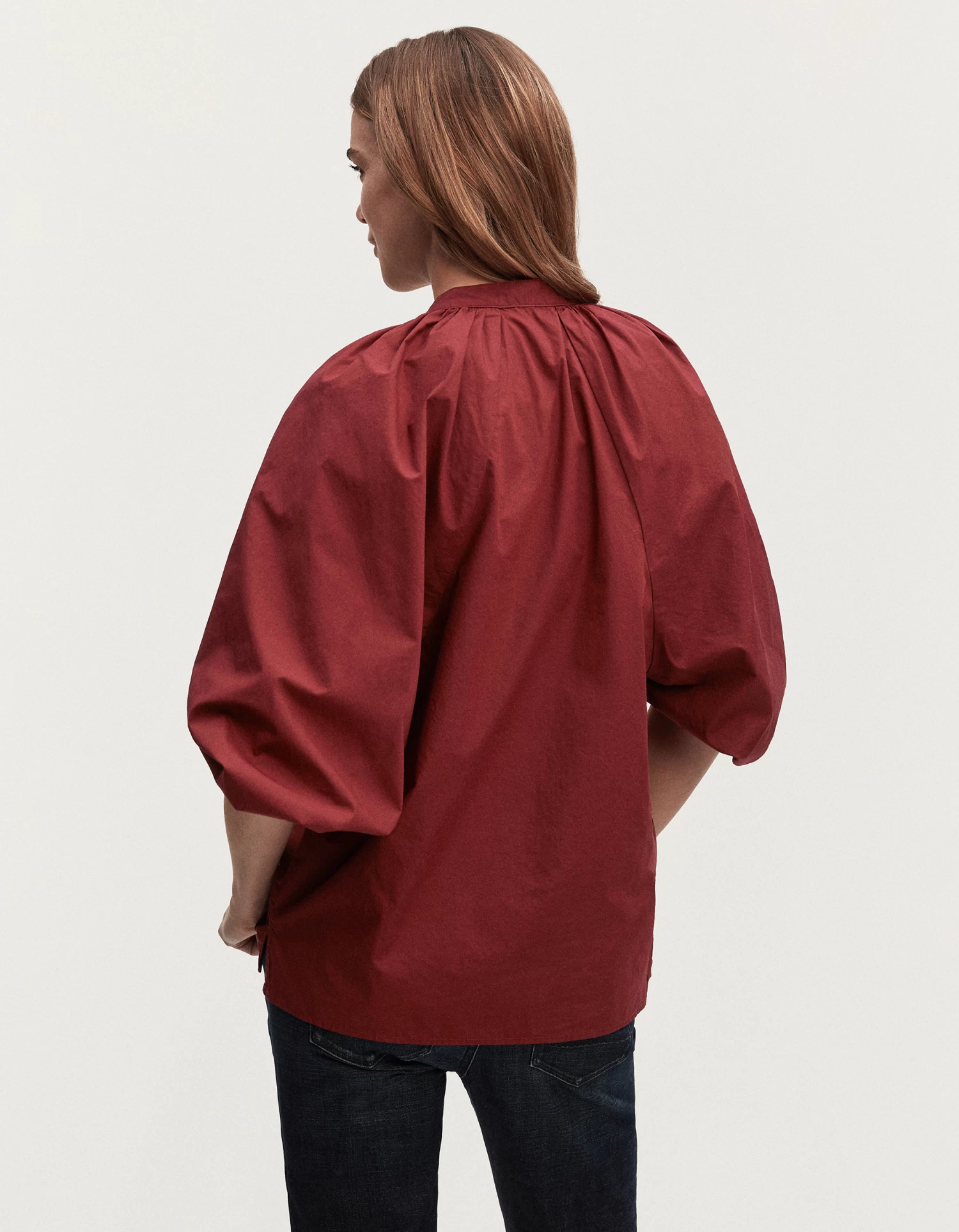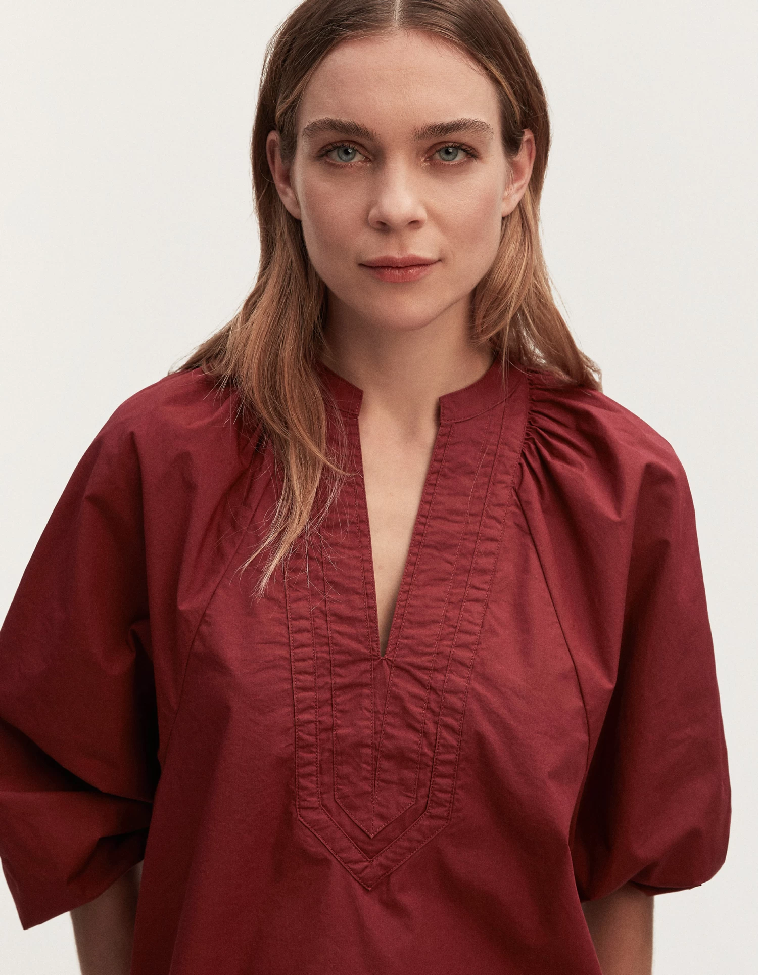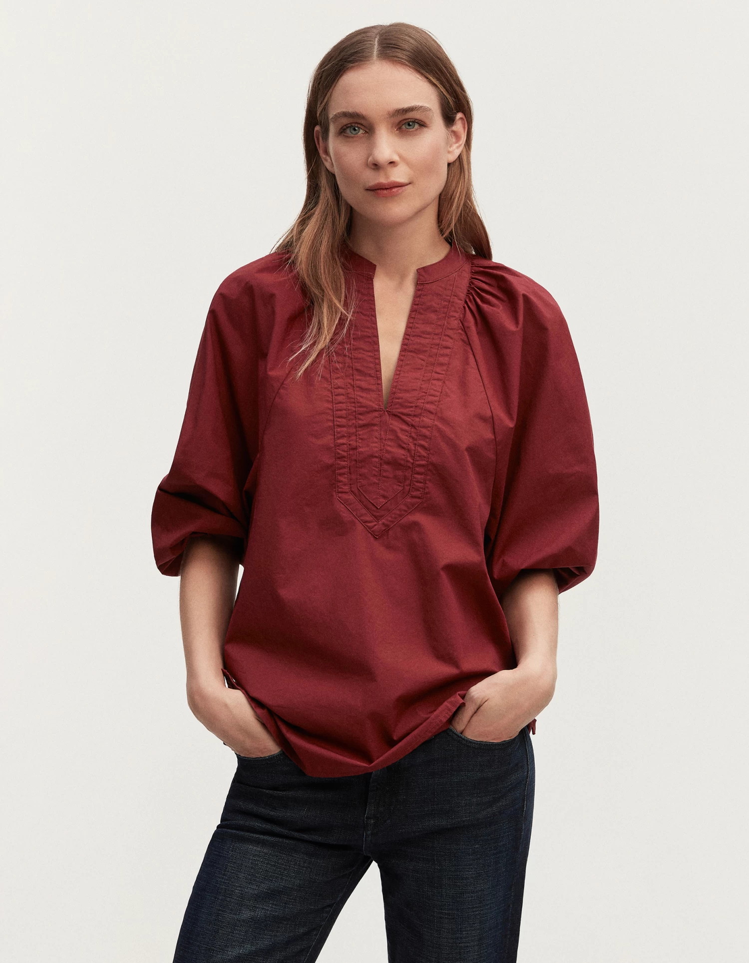 The MIKKI TOP is a v-neck blouse for women. Made from classic cotton poplin fabric, this regular-fit top features an open v-neck line with panel detailing on the front and oversized, balloon-styled sleeves. Available in our seasonal colours.