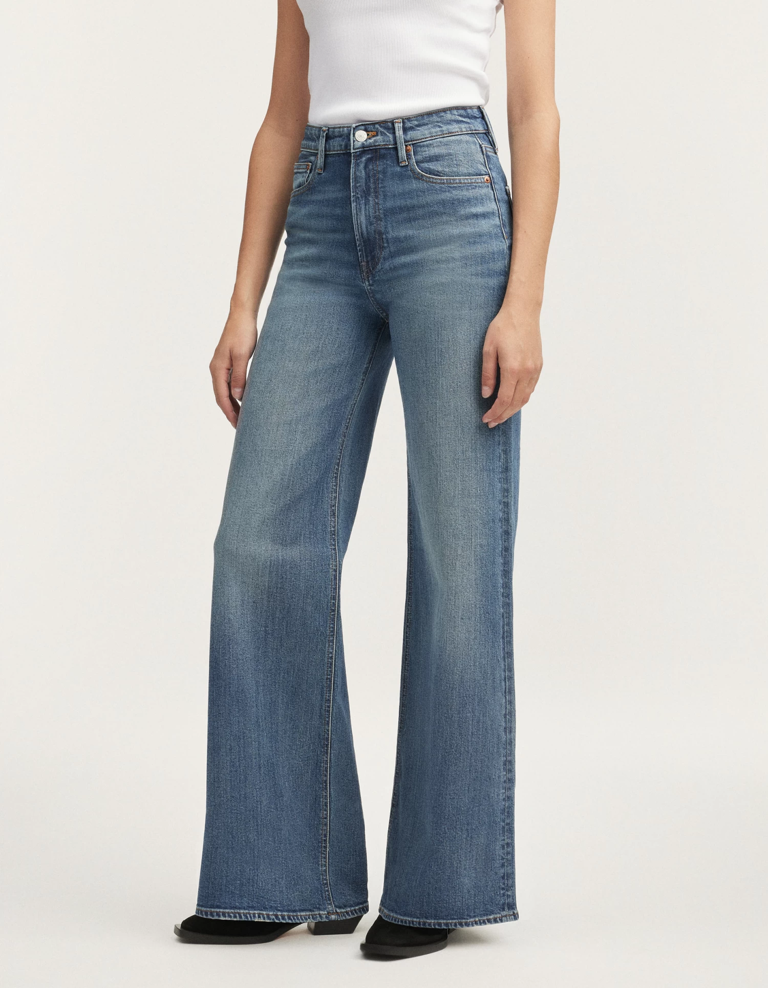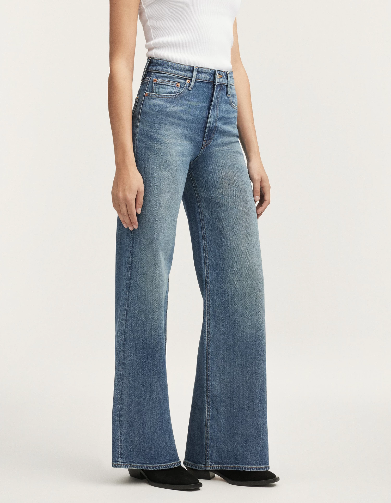 FIT: Our new wide flare jean. Featuring a high-rise waist and form-fitting silhouette that lengthens into a wide flare. Crafted from stretch fabric for ultimate comfort.