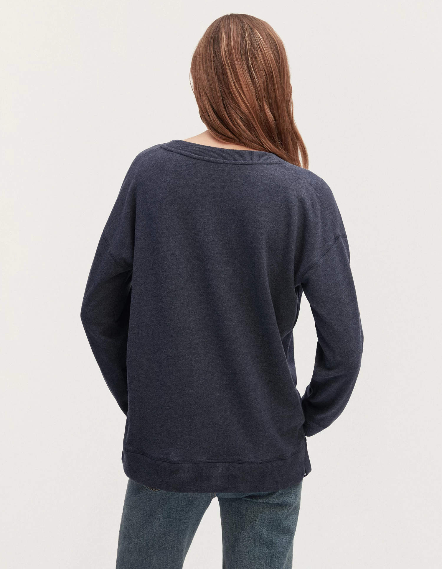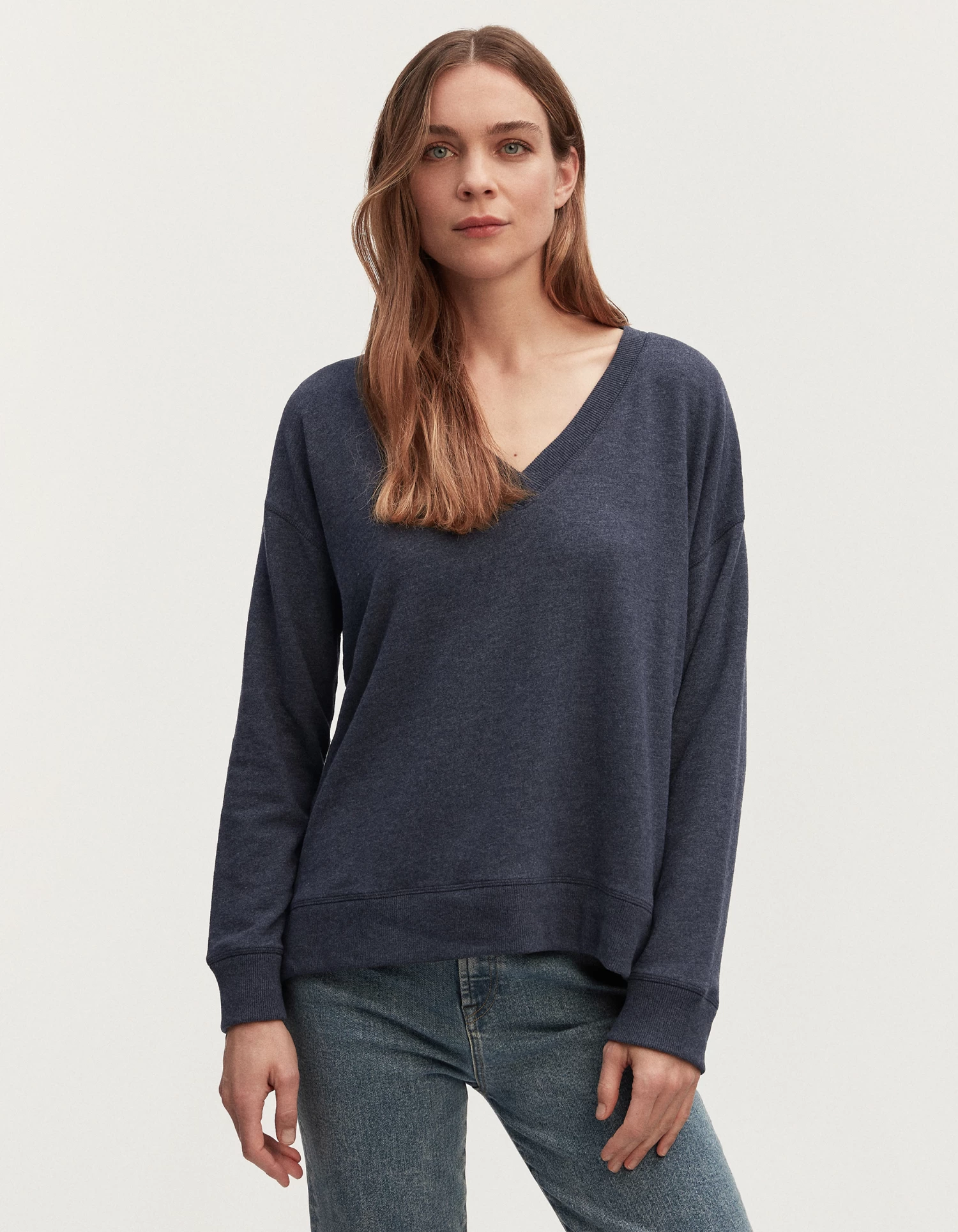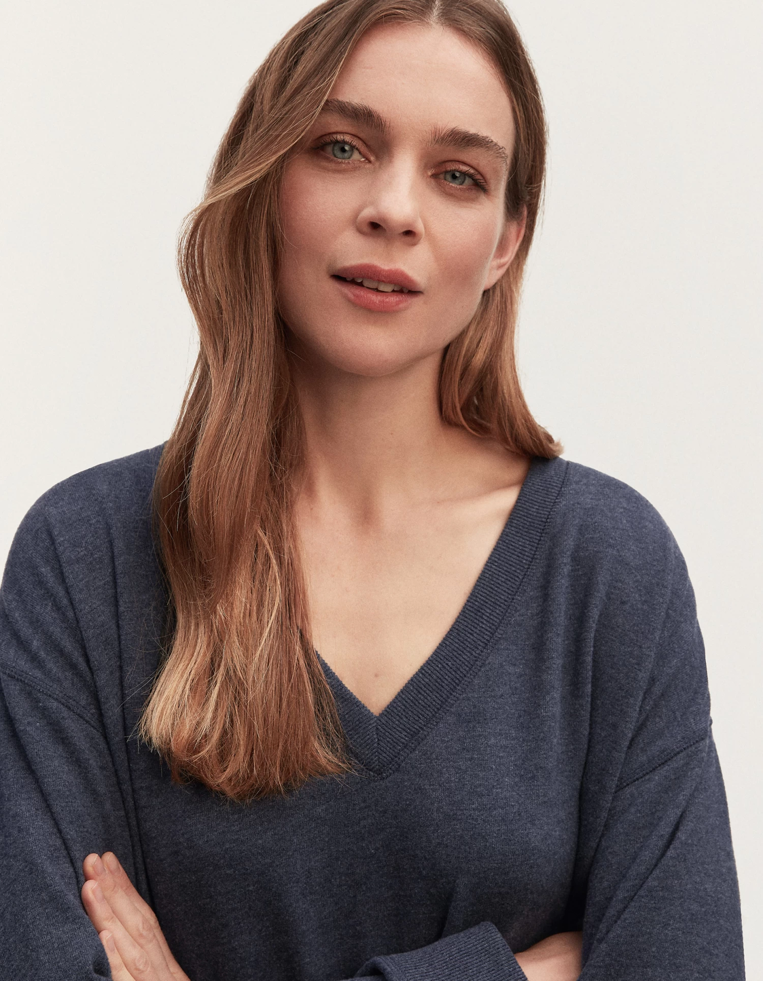 The OSKA V Neck Sweater is our updated v-neck sweater. Made from soft, cotton melange jersey, this sweater features an open V neckline, with a split hem detailing for a natural drape.
