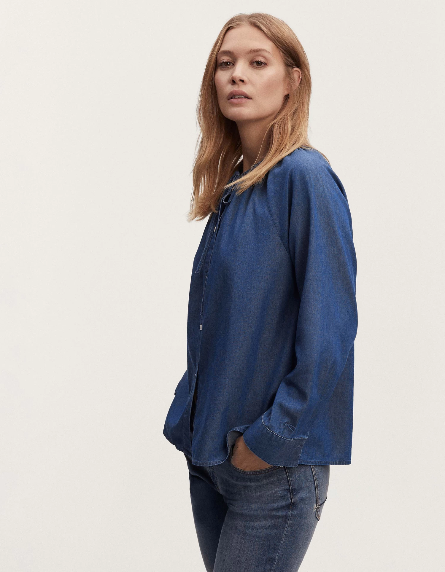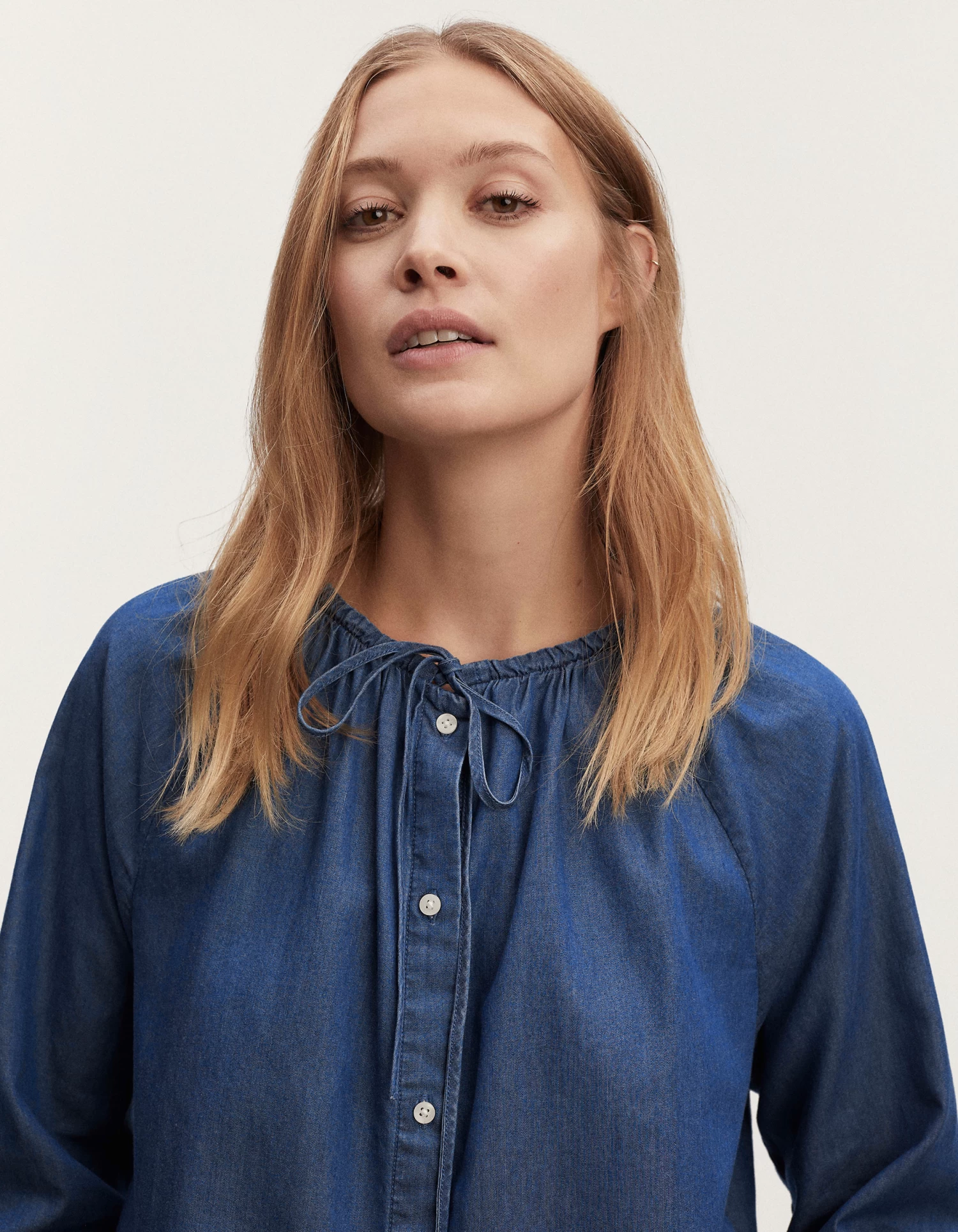 The PAMELA SHIRT is a floaty, long-sleeved regular fit shirt. Made from lightweight, indigo cotton fabric, this style has drawcord detailing at the neck and a dainty button-up closure on the front.