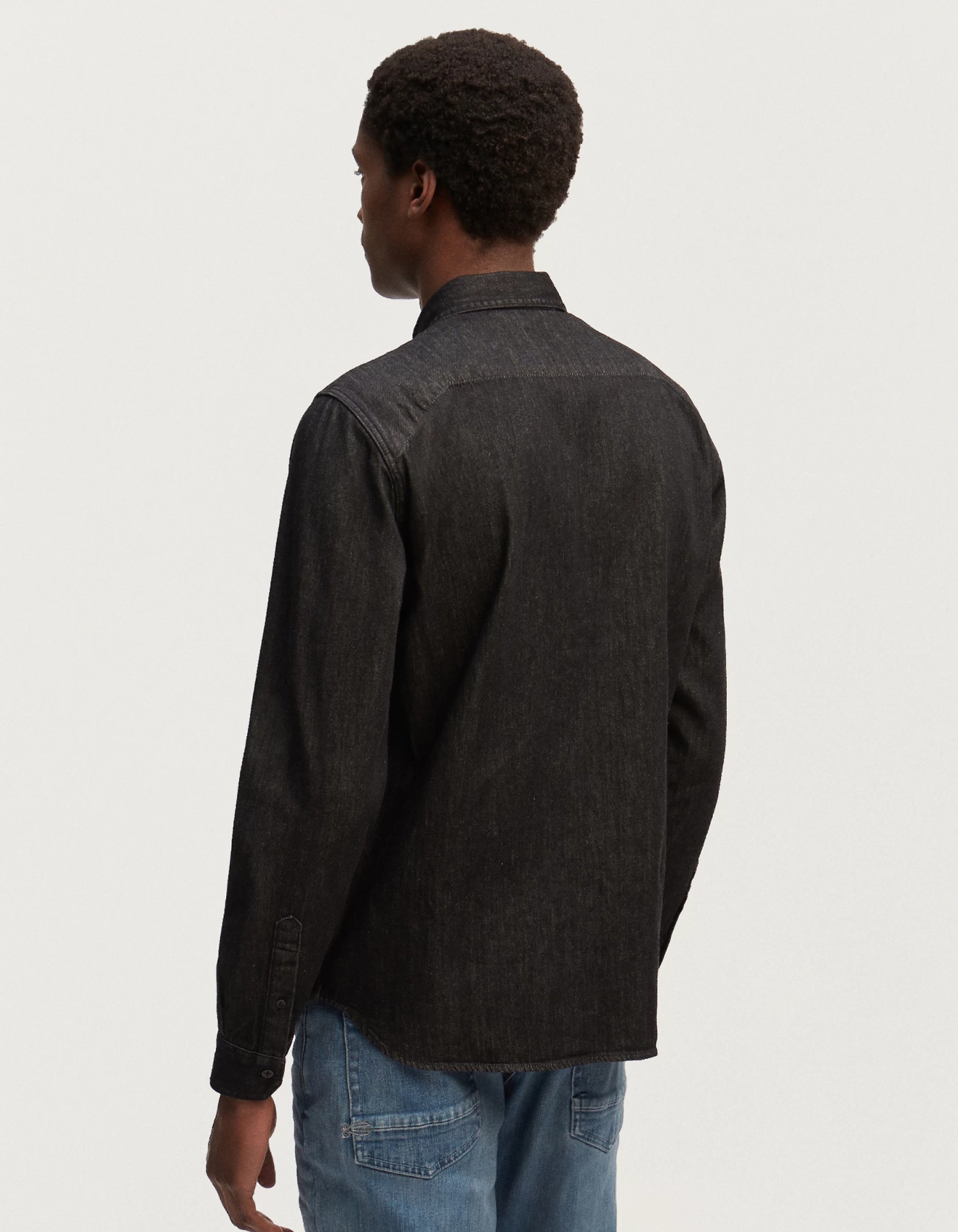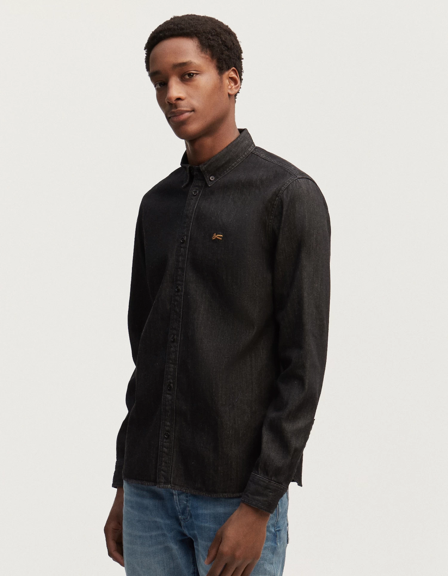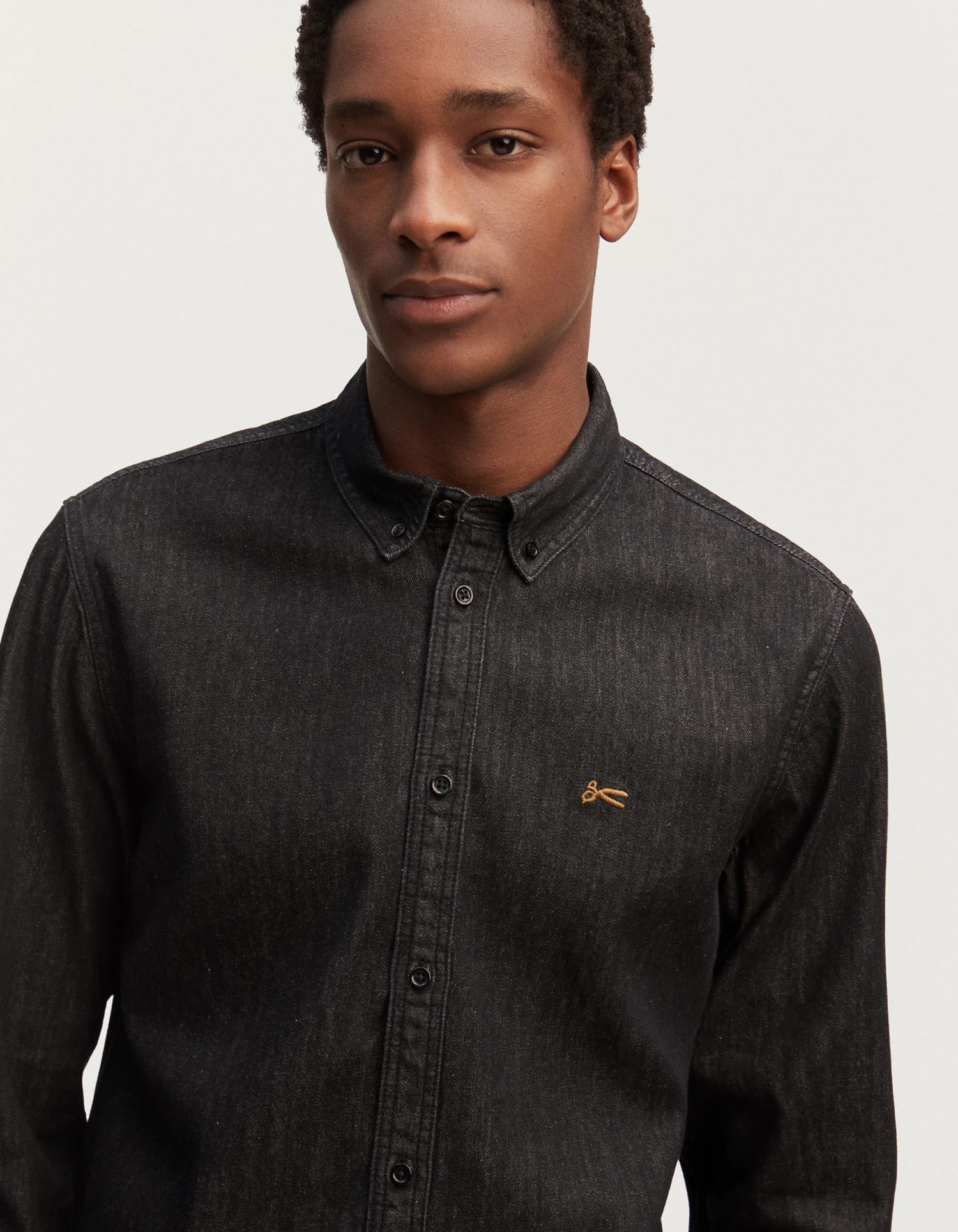 The RICH SHIRT is our regular-fit shirt for men. This style is made from premium black denim, with a clean rinse wash, and features our scissor logo embroidered on the chest.