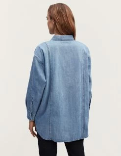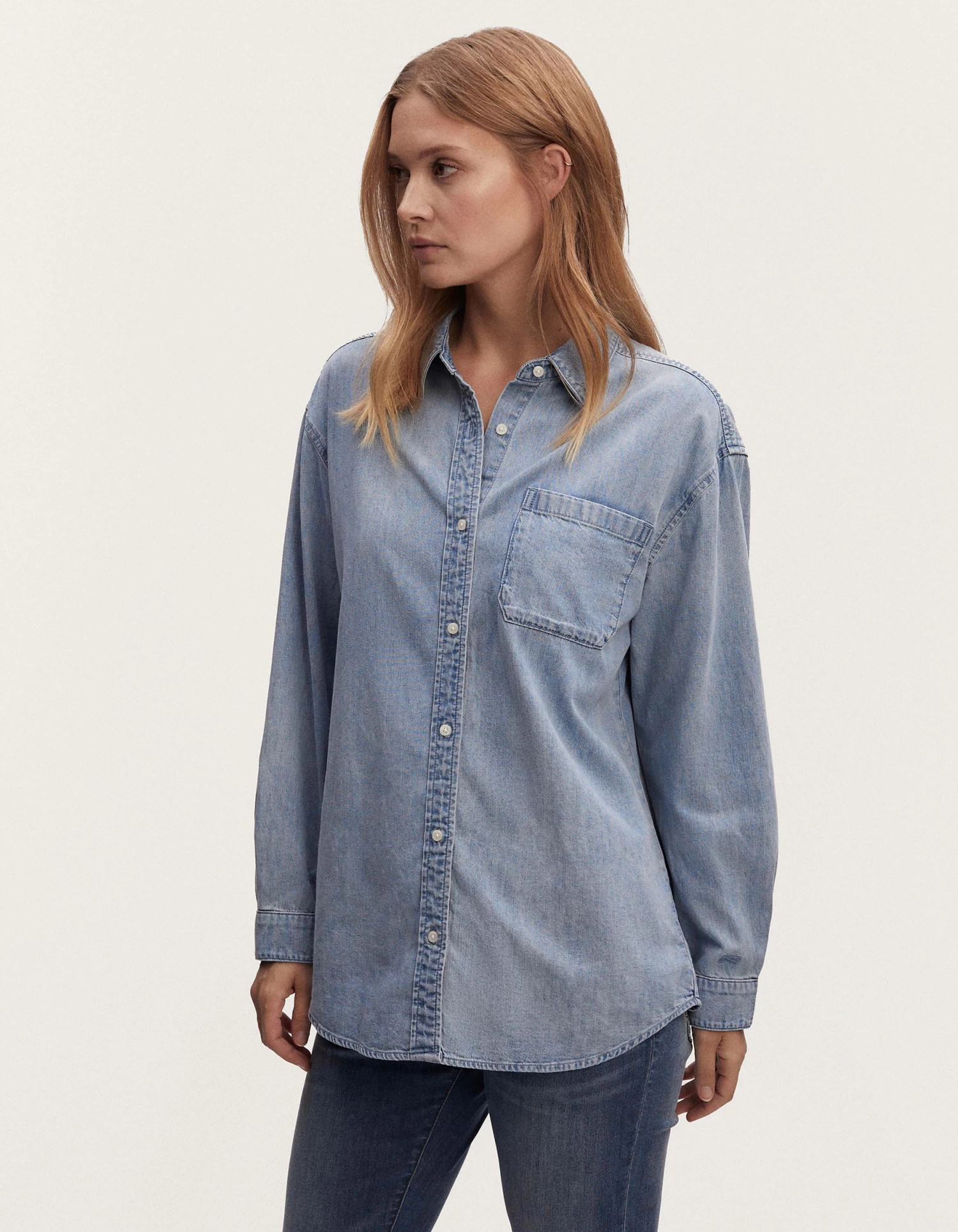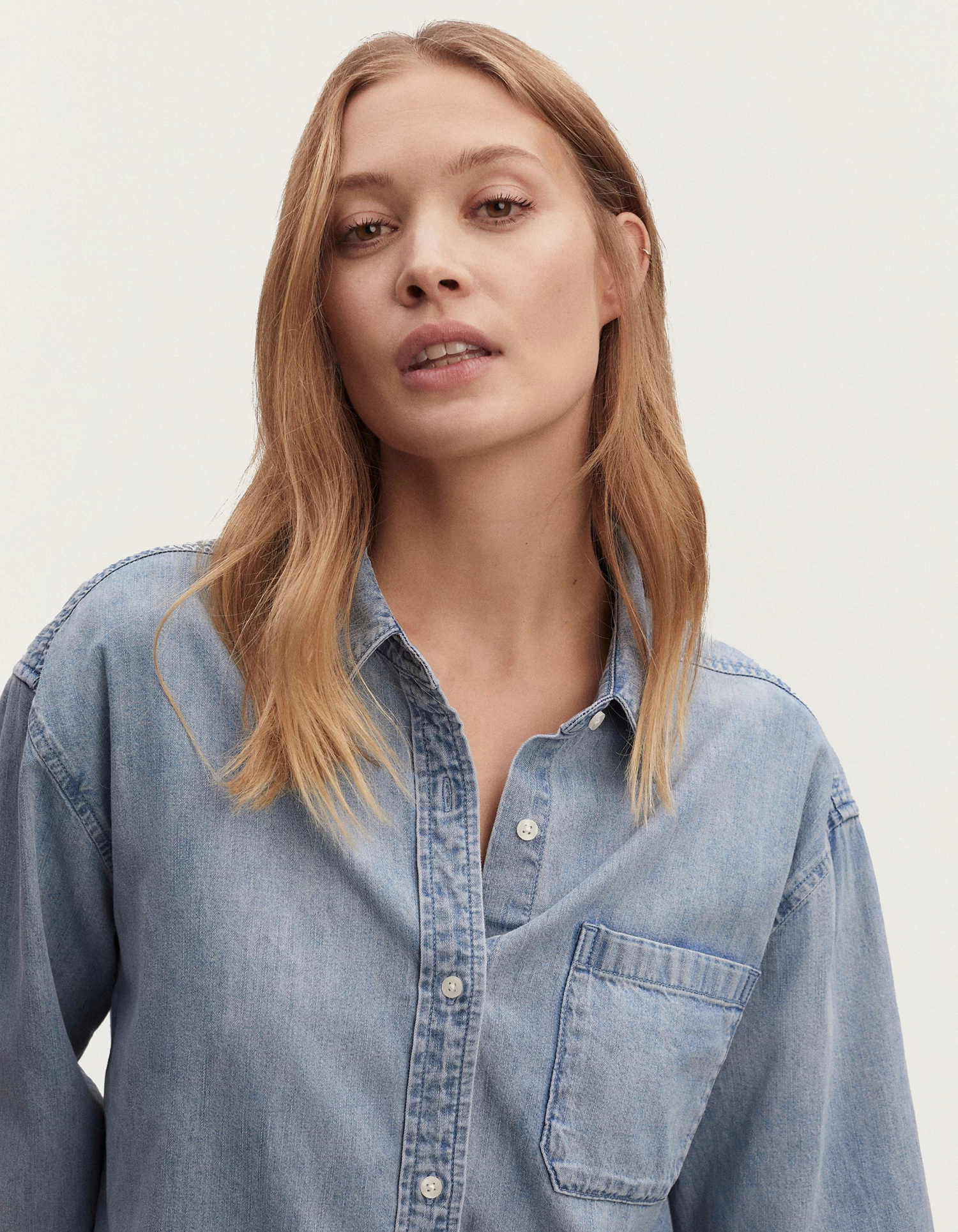 The UMA SHIRT is our regular-fit, button-up shirt made from light-agedly stonewashed denim. This style features a single chest pocket and dainty closure on the front.